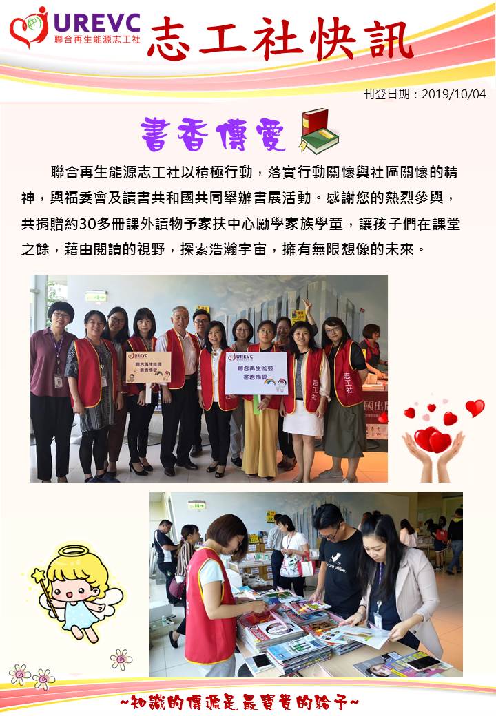 聯合再生能源志工社以積極行動,落實行動關懷與社區關懷的精神,與福委會及讀書共和國共同舉辦書展活動。感謝您的熱烈參與,共捐贈約30多冊課外讀物............. 更多...